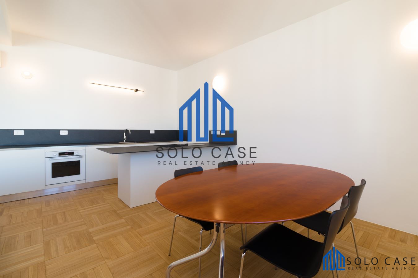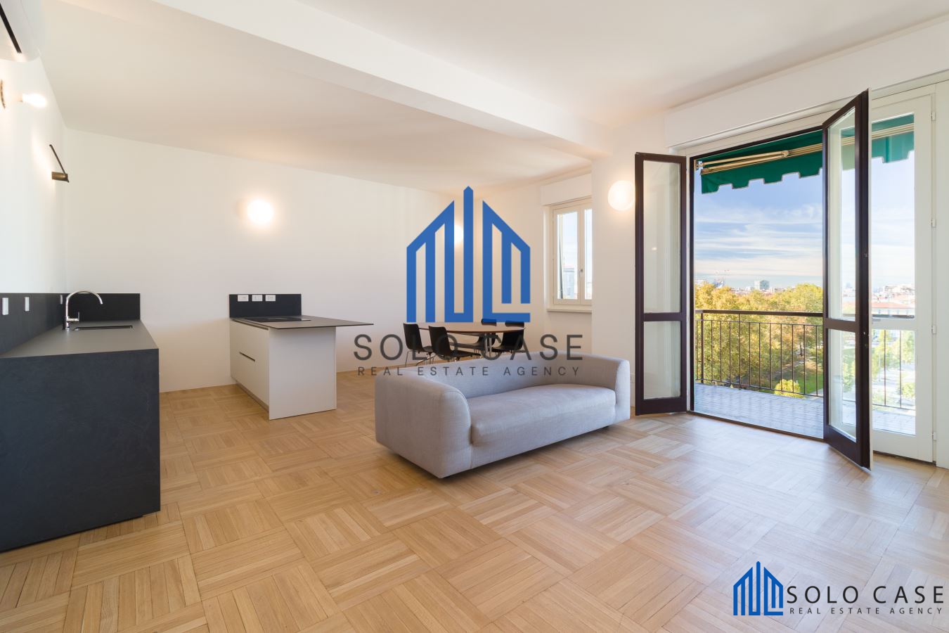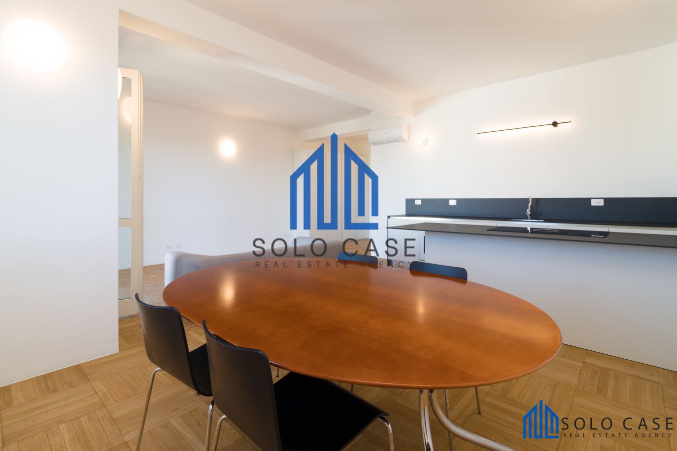 La zona giorno doppia  con pavimentazione in parquet è di grande respiro, con spazi organizzati da architetto, da un lato la moderna cucina con isola moderna ed isola centrale, tavolo e sedie di design italiano De Padova e Cassina, zona divano Tv con uscita su terrazzino dalle viste iconiche e libere,  grazie alla posizione unica e l' assenza di edifici circostanti, l' affaccio spazia da City Life fino alle montagne.