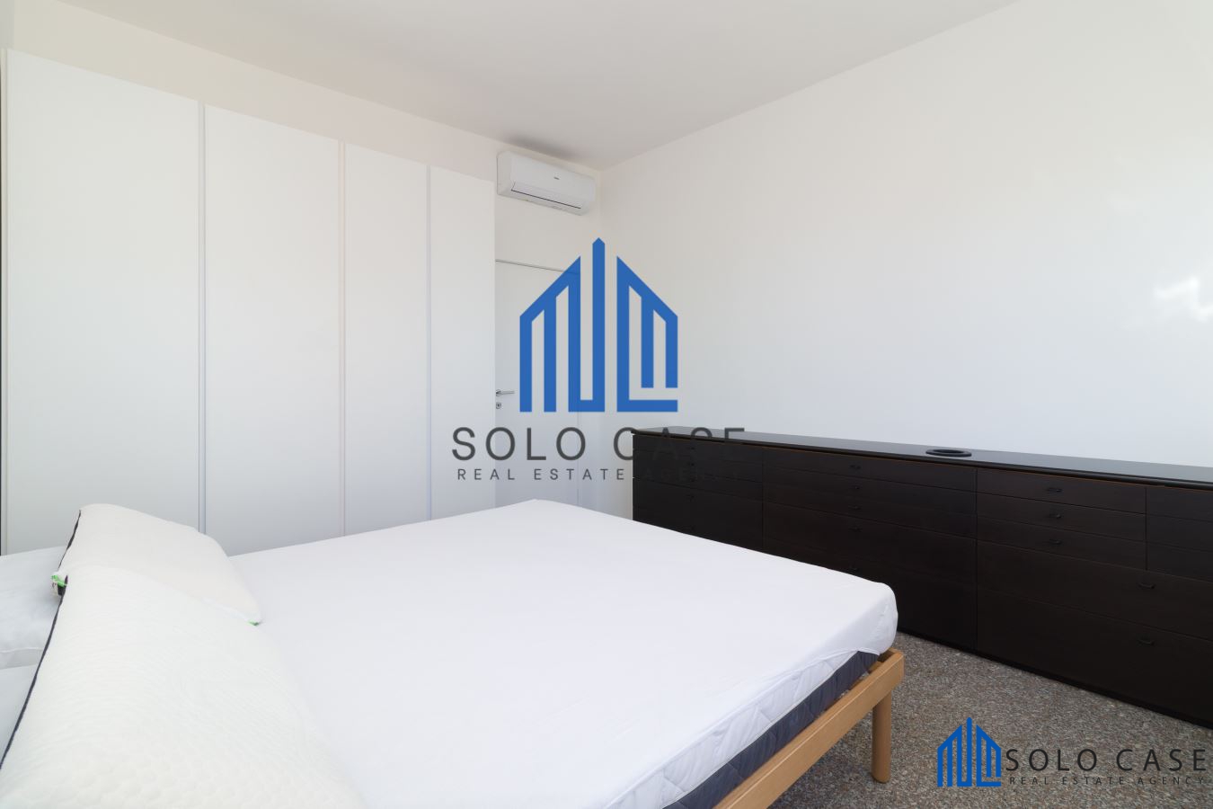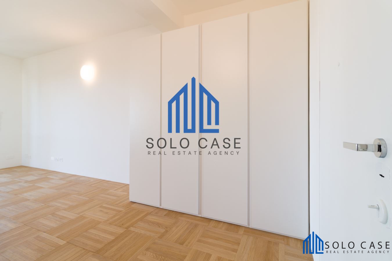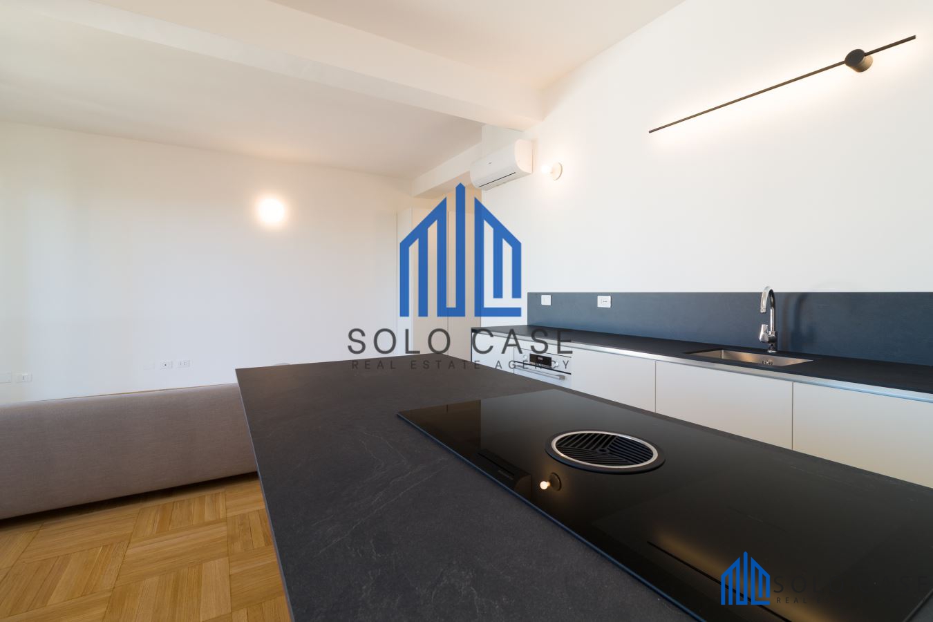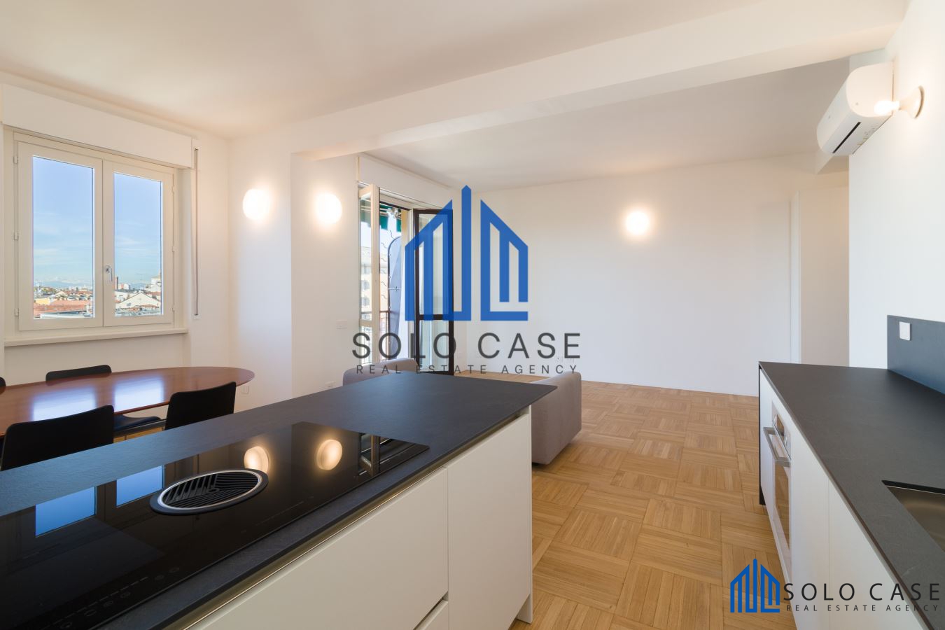 La zona giorno doppia  con pavimentazione in parquet è di grande respiro, con spazi organizzati da architetto, da un lato la moderna cucina con isola moderna ed isola centrale, tavolo e sedie di design italiano De Padova e Cassina, zona divano Tv con uscita su terrazzino dalle viste iconiche e libere,  grazie alla posizione unica e l' assenza di edifici circostanti, l' affaccio spazia da City Life fino alle montagne.