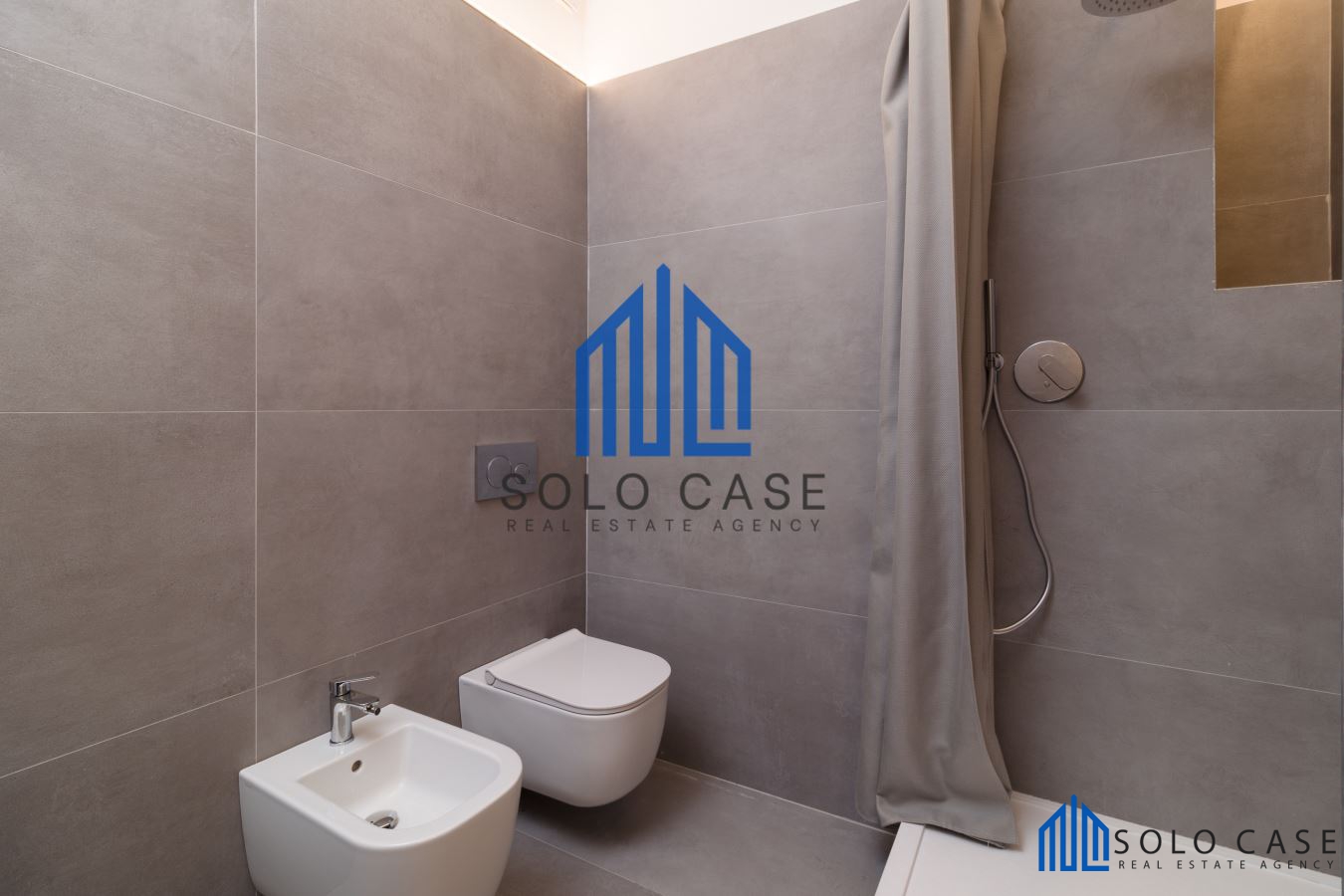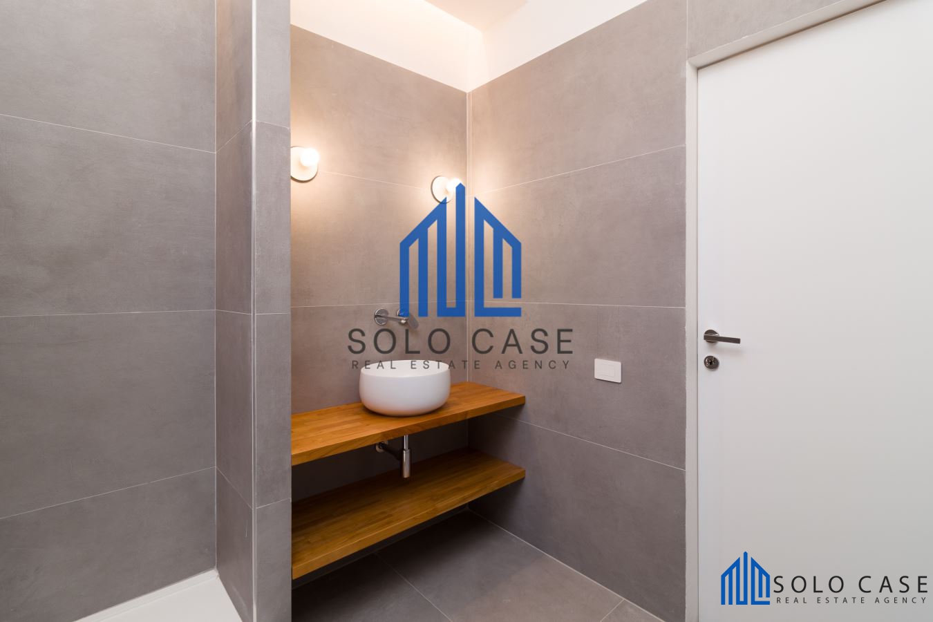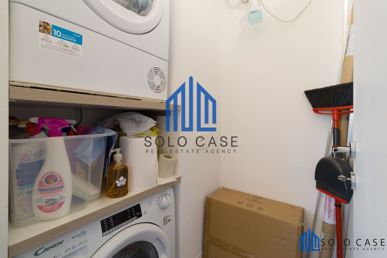 Un disimpegno con zona lavanderia, attrezzata di lavatrice ed asciugatrice precede il bagno, con sanitari sospesi .