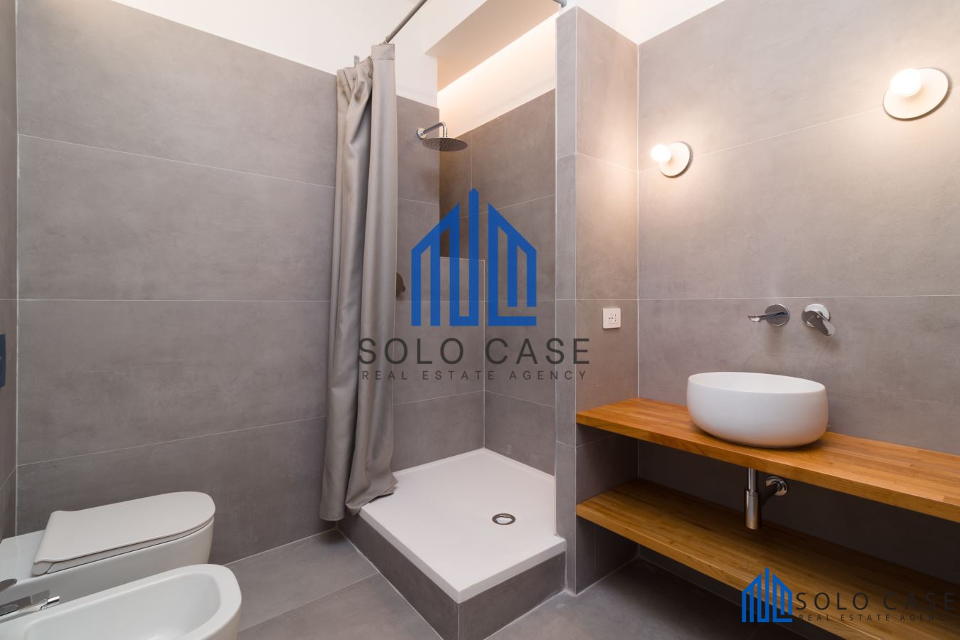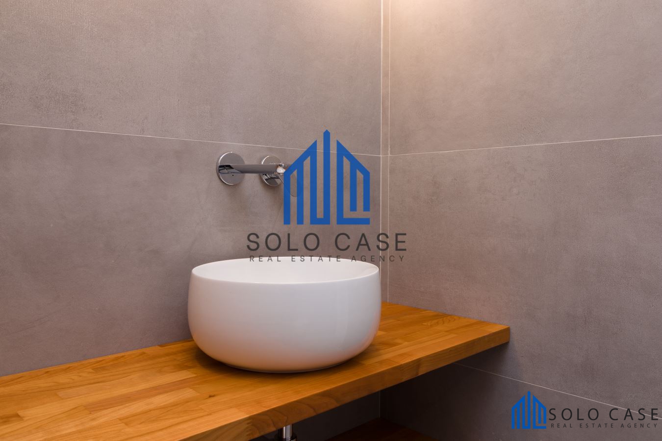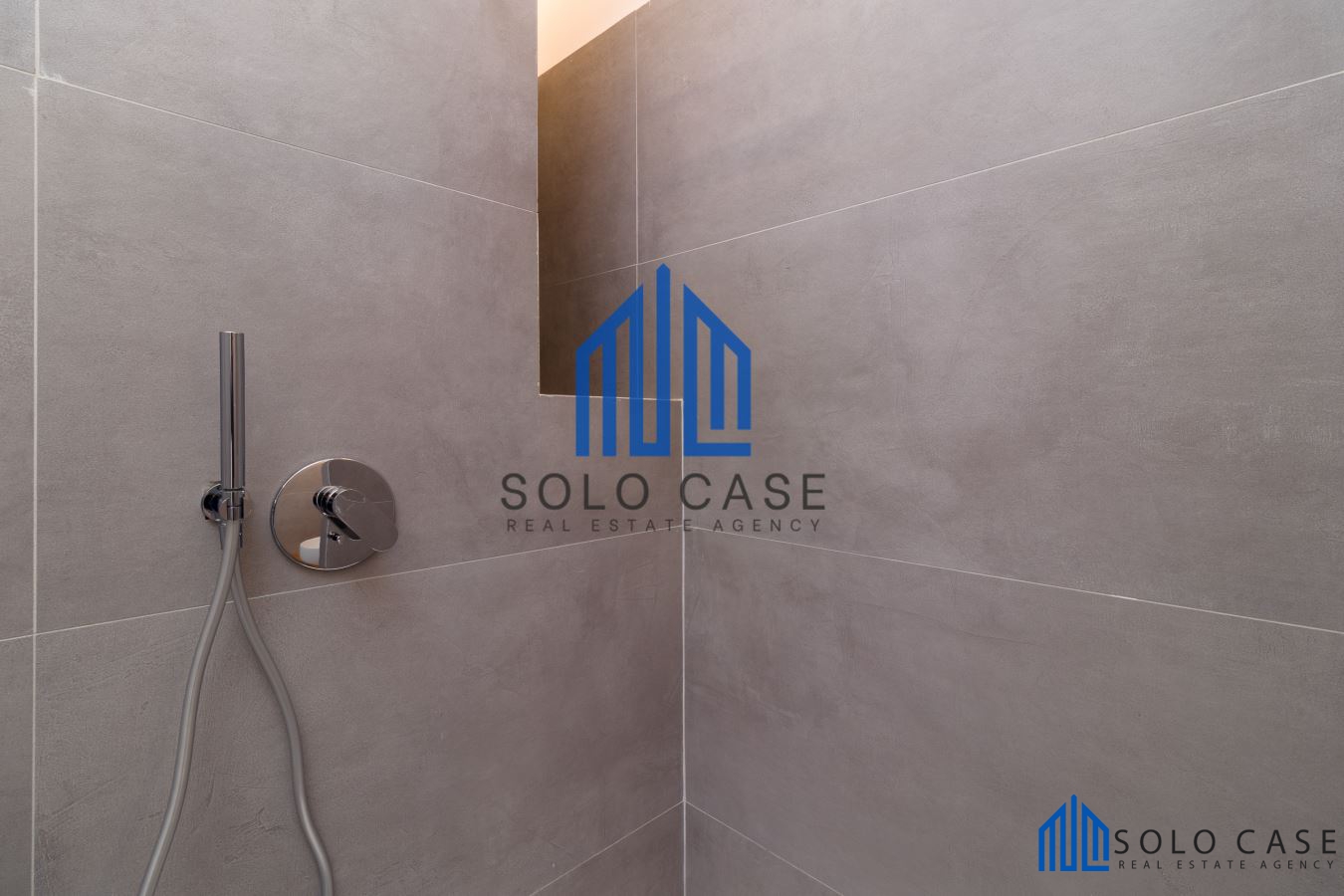 Un disimpegno con zona lavanderia, attrezzata di lavatrice ed asciugatrice precede il bagno, con sanitari sospesi .