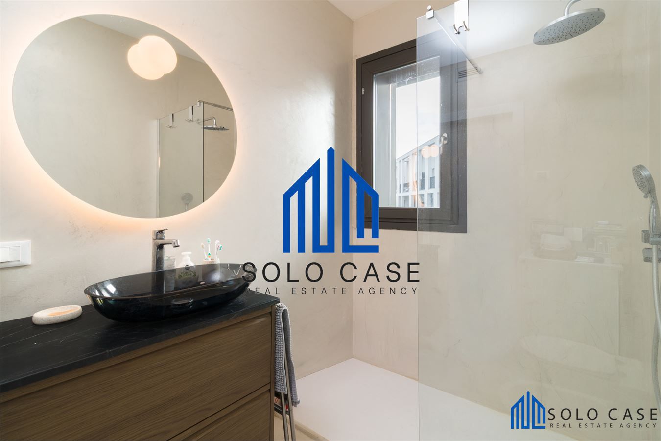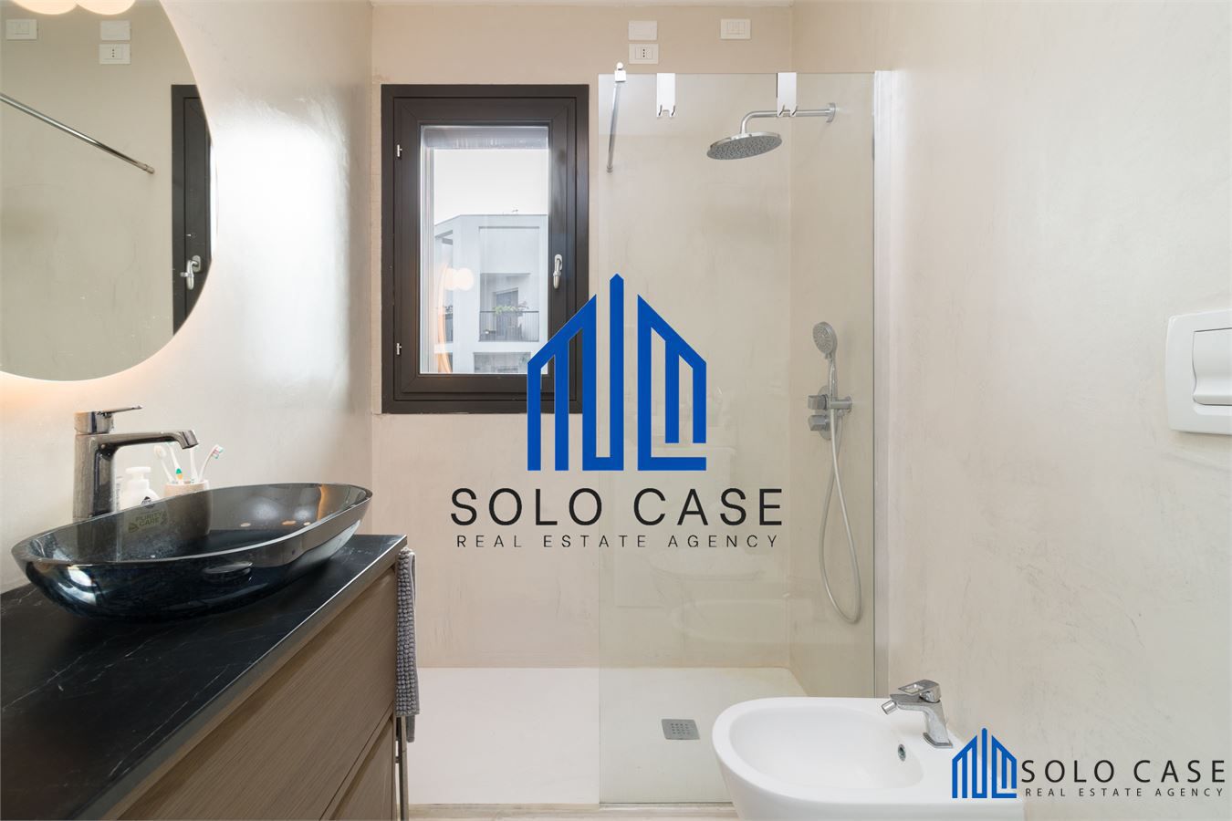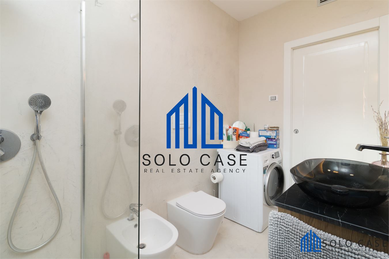 Il bagno anch' esso di design in micro cemento, completo di lavasciuga.