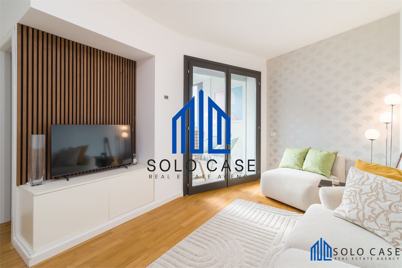 La modernità dell' edificio, sposa perfettamente il design della casa come il divano posto nell' area living, tv con schermo da 42' libreria e lampade.