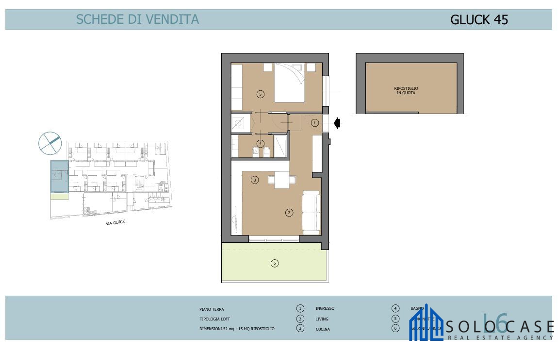 - Bilocale denominato "L6". Trattasi di un bilocale piano terra di ca. 52 mq con giardino privato e di proprietà di ca. 10 mq composto come segue: ingresso, soggiorno con cucina a vista, camera, bagno e ripostiglio in quota.
